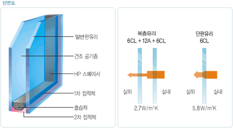 • 복층유리는 최소 두장의 판유리와 스페이서(SPACER)를 이용하여 건조한 공기층을 갖도록 만들어진 유리로써, 창문으로 빠져나가는 열에너지 양을 줄여주어 단열 및 결로방지효과를 가지고 있습니다.